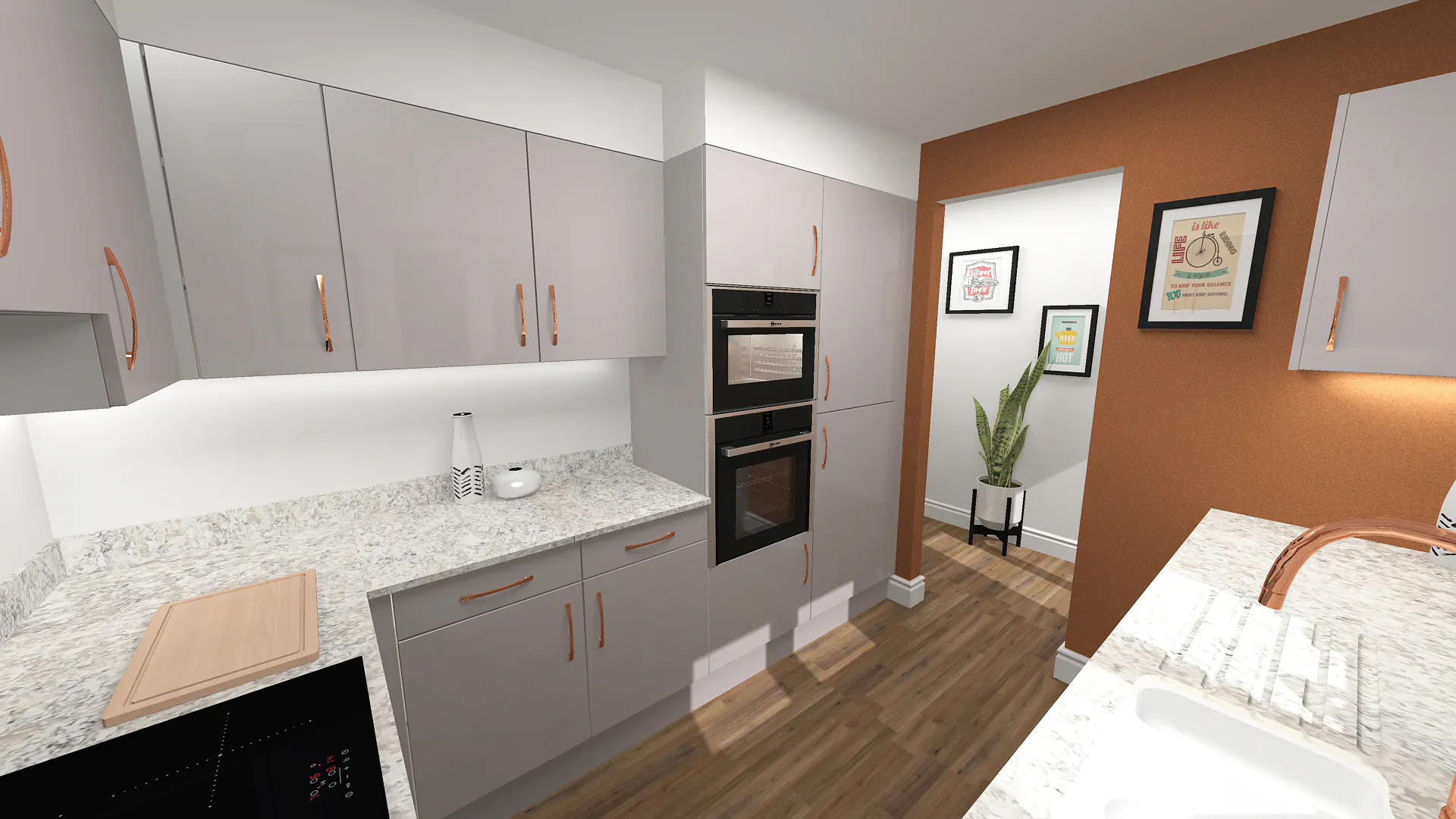 Ms. Duck opted for a transition from gas to an induction hob, further emphasizing the streamlined look. Copper handles, taps, and splashbacks complemented the Kashmir gloss doors, while the subtle copper veins in the quartz surfaces brought the whole room together.