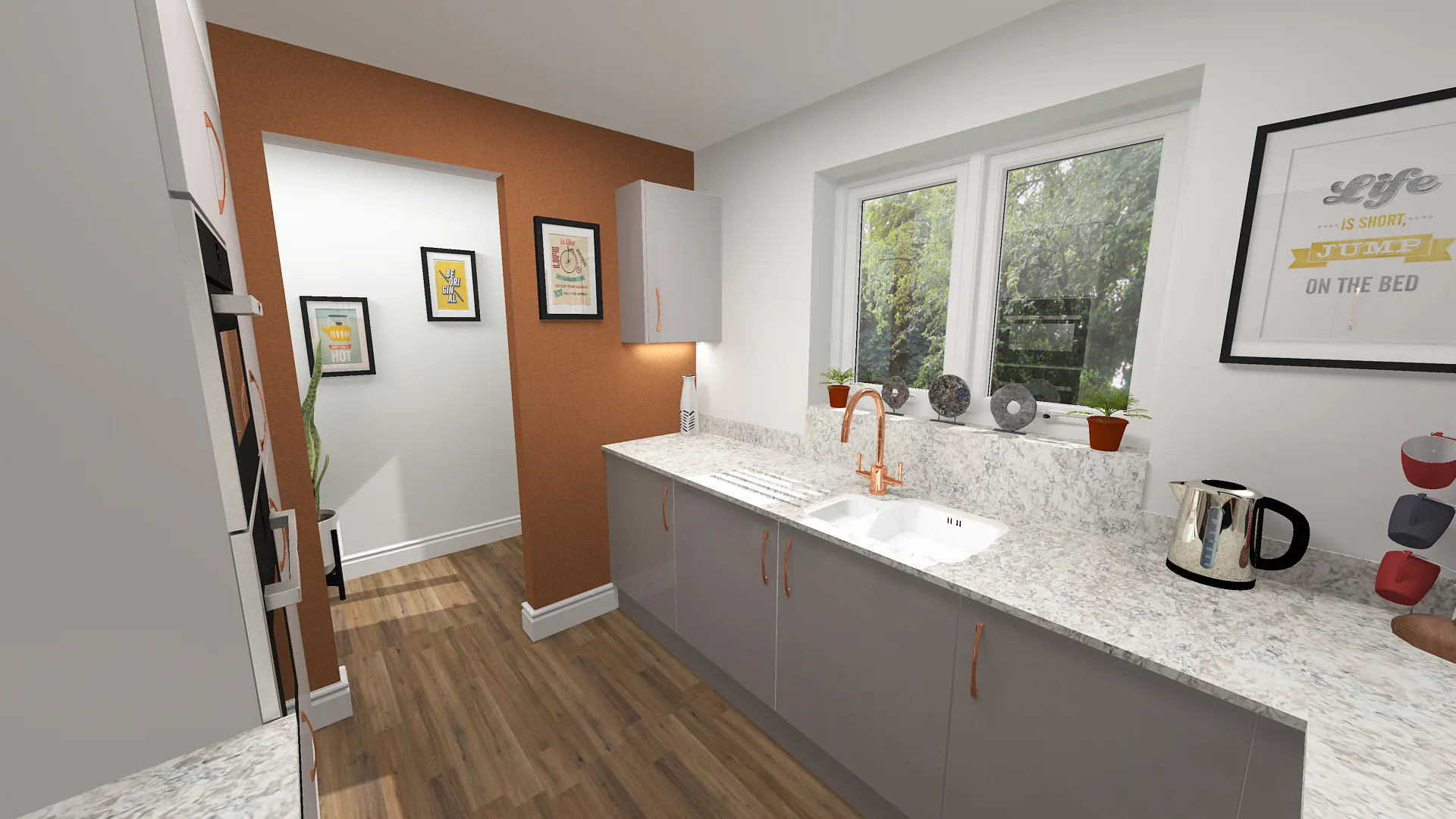 Addressing the inefficient layout, Julie recommended relocating an integrated fridge freezer to the previously underused space next to the oven, grouping the tall units together and leaving the window area open to maximize light. Since the door from the hallway was rarely used and interrupted the kitchen flow, it was removed, and the entrance was plastered square for a clean finish.