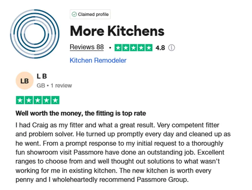 “I had Craig as my fitter and what a great result. Very competent fitter and problem solver. He turned up promptly every day and cleaned up as he went. From a prompt response to my initial request to a thoroughly fun showroom visit, Passmore have done an outstanding job. Excellent ranges to choose from and well thought out solutions to what wasn't working for me in the existing kitchen. The new kitchen is worth every penny, and I wholeheartedly recommend More Kitchens & Passmore Group.”