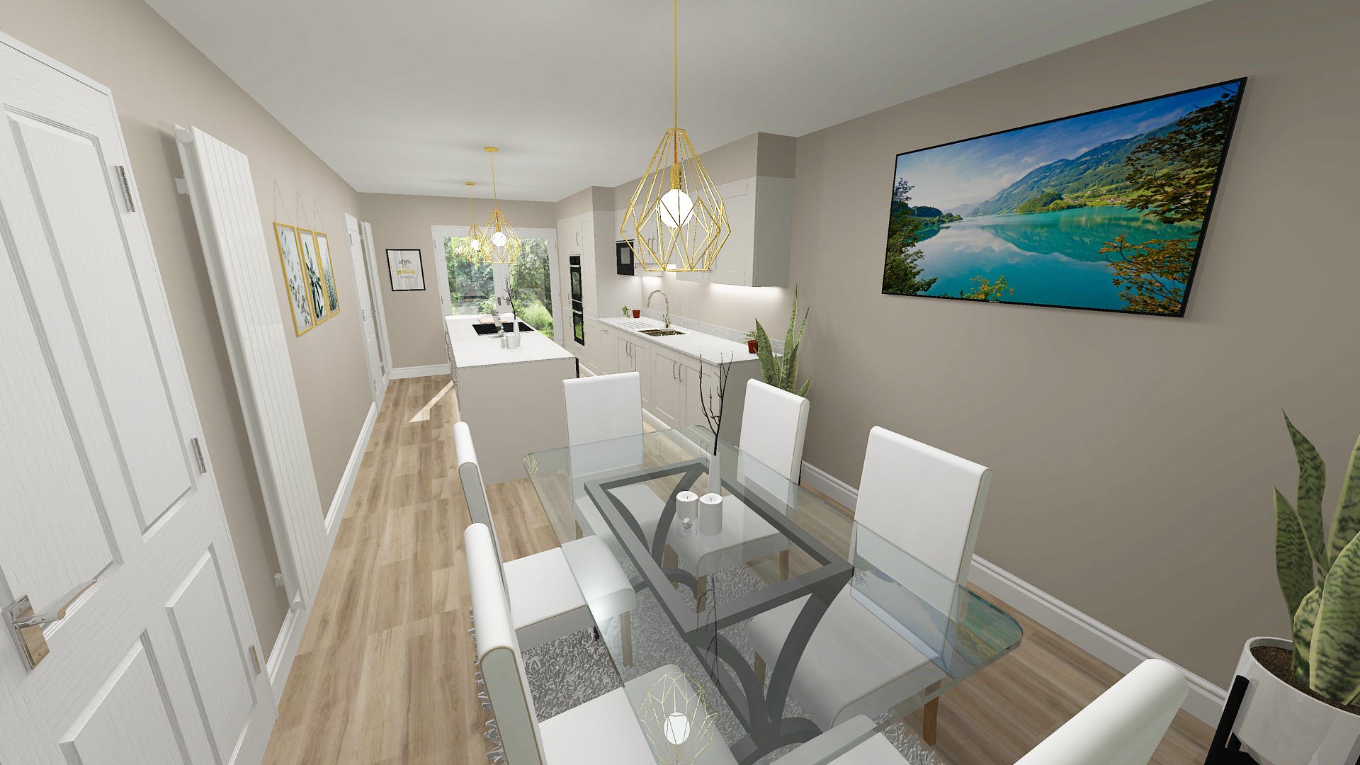 The wall between the kitchen and dining room was removed to achieve a bright, open-plan layout. The original kitchen-to-hallway door was blocked up to create a more streamlined flow from the dining area. This reconfiguration not only optimised space but also improved day-to-day functionality.