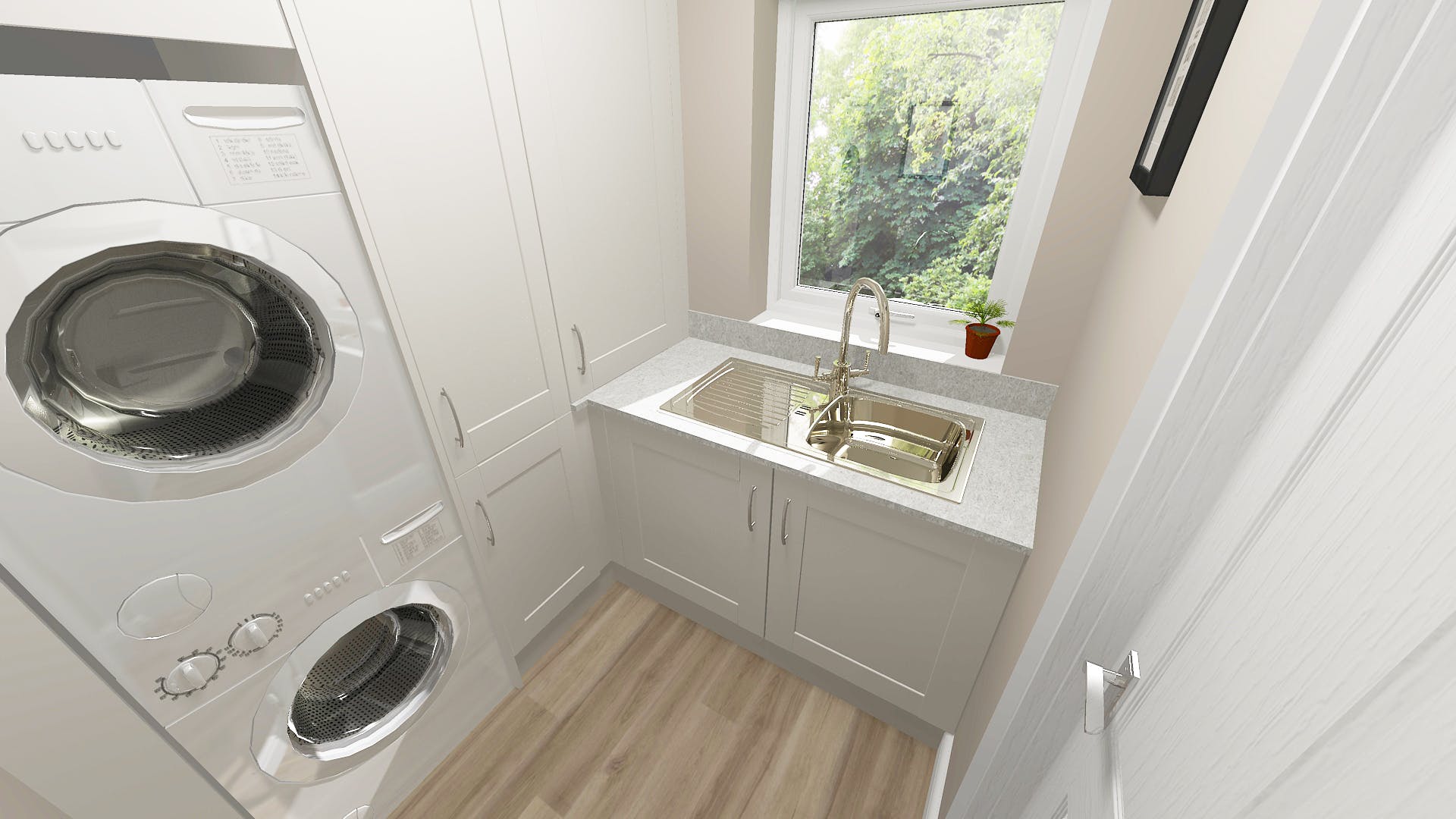 Finishes were carefully selected to achieve a classic and cohesive aesthetic. The kitchen featured Pendle Bleached Stone cabinetry in a paint-to-order timber shaker style, paired with Irini Quartz work surfaces for a refined, neutral palette. The design was completed with an under-mount sink in the kitchen, an inset steel sink in the utility, and Freshfield Oak LVT flooring flowing seamlessly through the kitchen, utility, hallway, and cloakroom.